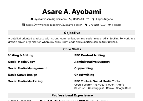 Hi, I’m Ayobami Asare, SEO Content Writer and Social Media Manager.